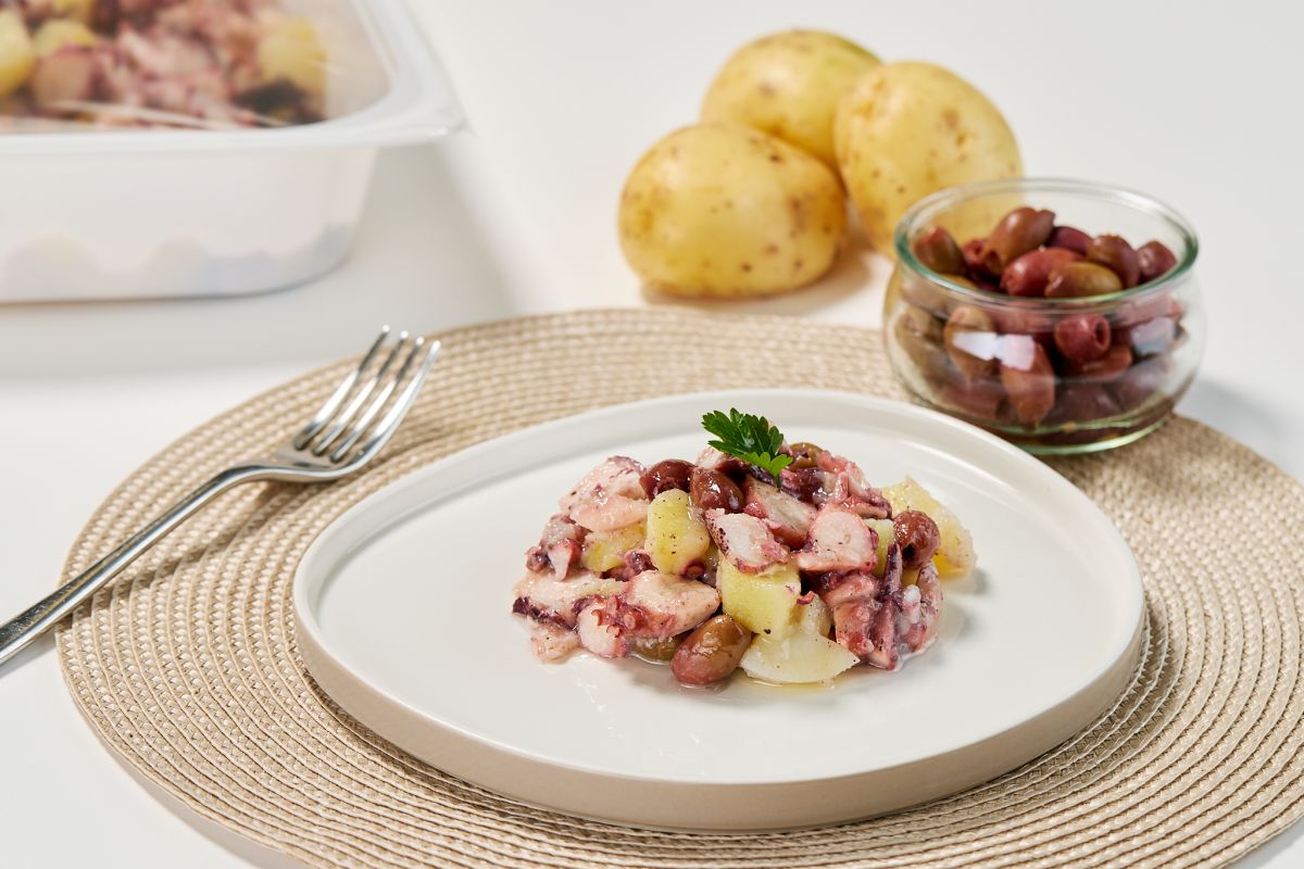L'insalata di polpo, patate e olive è un piatto mediterraneo fresco e leggero, preparato con polpo lessato, patate a cubetti, olive e condito con olio d'oliva, limone e prezzemolo. Perfetta come antipasto o piatto unico.